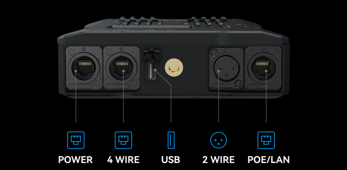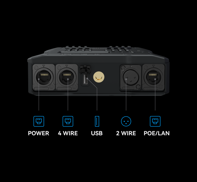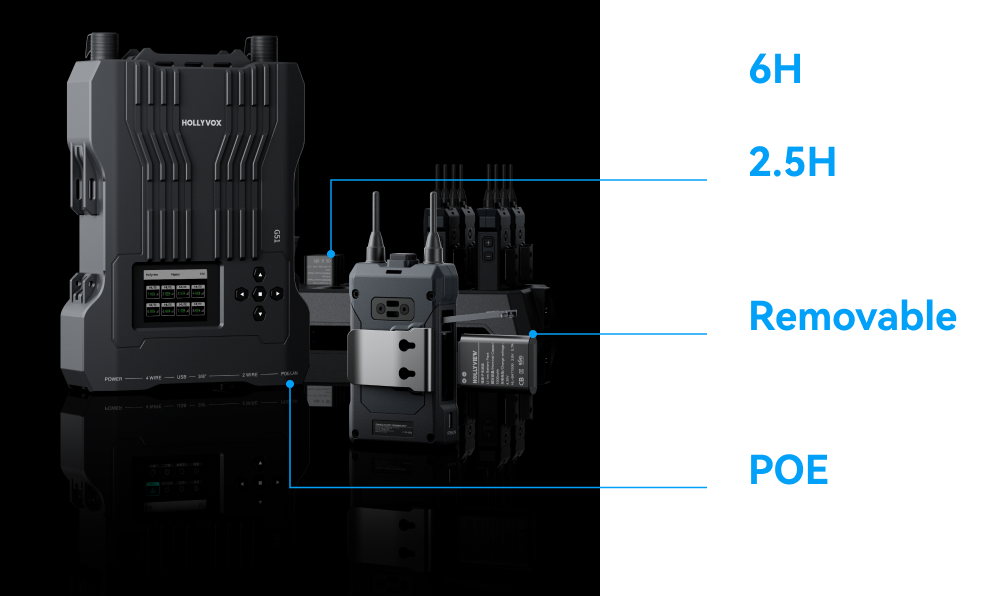 Each beltpack comes with two replaceable lithium polymer batteries with an operating time of up to 6 hours. The included charging base completely alleviates concerns about low power, as it can fully charge 8 beltpacks and 8 batteries in merely 2.5 hours at a time. The base station supports power supply through POE or NP-F batteries, ensuring uninterrupted communication regardless of the power source.